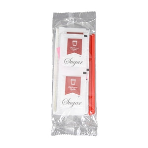 Clear Condiment Packs: Compliment your coffee service. Clear packets include: 2 sugar, 2 sugar substitute, 2 creamer, 2 plastic stir sticks, 1 napkin.