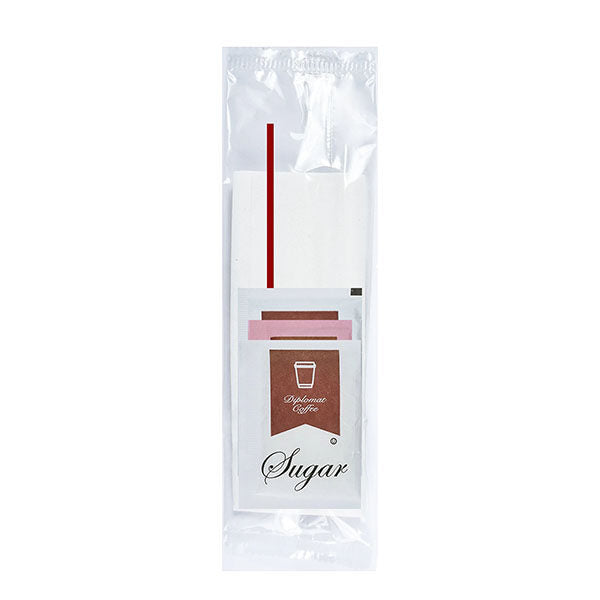 This simple, economical hot beverage condiment kit is perfect for coffee service and is ideal for use in your office or hotel room. This condiment kit includes one sugar packet, one sugar substitute, one creamer, one plastic stirrer and one napkin.
