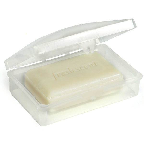 Clear, hinged soap dish will hold up to a 5oz bar of soap.