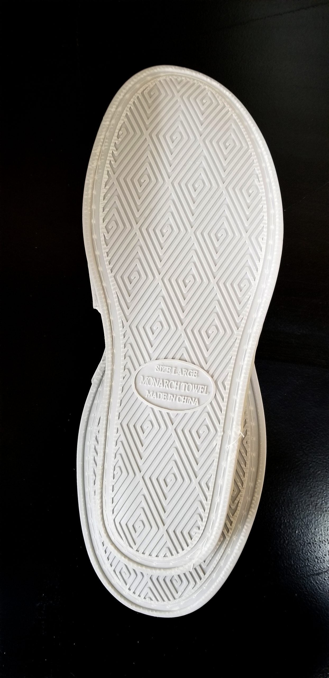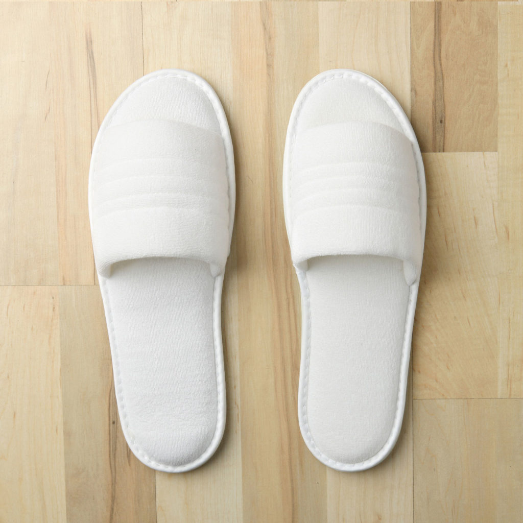 An open-toe slipper with a terry cloth upper and foot bed. Can be washed by hand and air dried.